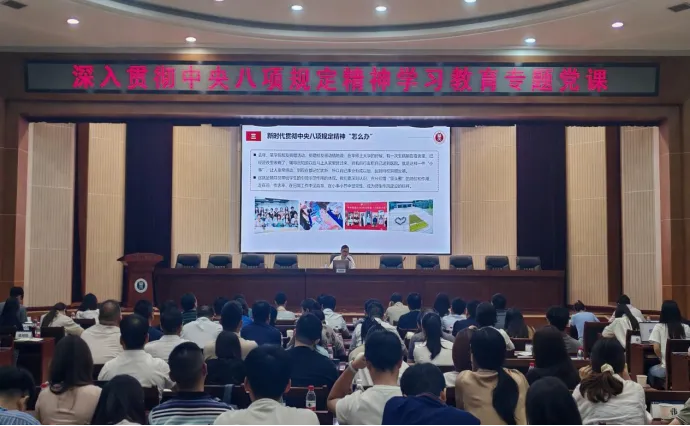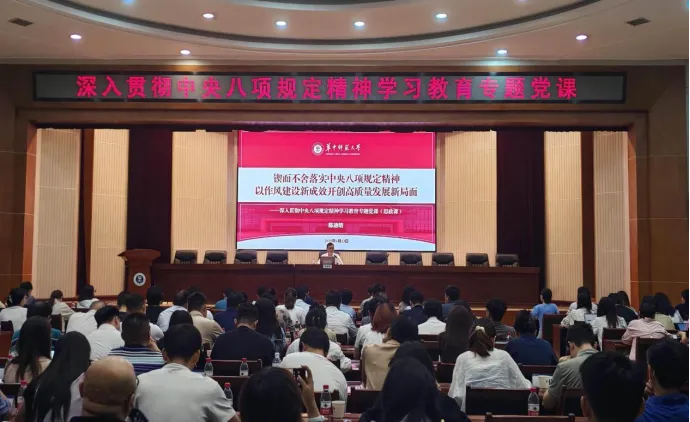 The Voice of CCNU On June 23, the "Special Party Class (Ideological and Political Course) on Deeply Implementing the Spirit of the Eight Central Regulations" for student affairs staff was held in the first-floor lecture hall of the Science Hall. Chen Diming, Deputy Secretary of the Party Committee, delivered a thematic Party class to all political work cadres of the university, focusing on the theme of "Persistently Implementing the Spirit of the Eight Central Regulations and Ushering in a New Situation of High-Quality Development with New Achievements in Work Style Construction." Participants included all staff from the Party Committee Student Affairs Department, the University Youth League Committee, the Employment Office, as well as student work leaders from each training unit, all full-time and part-time undergraduate and graduate counselors, and student representatives. The special Party class was chaired by Yang Jun, Deputy Director of the Party Committee Student Affairs Department.