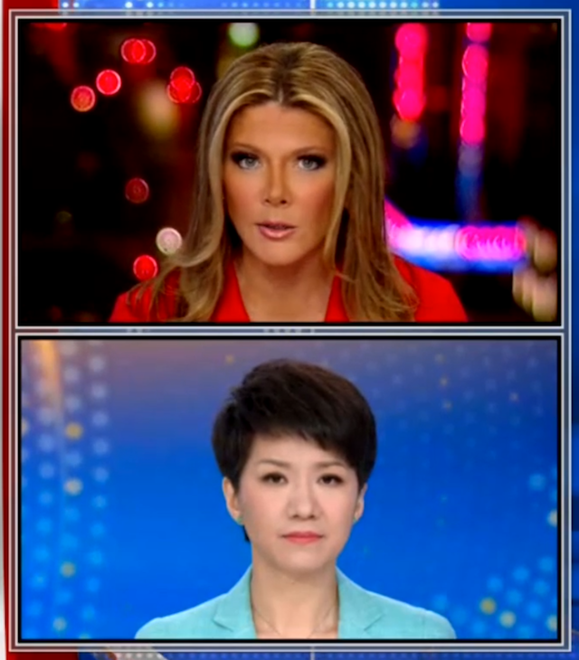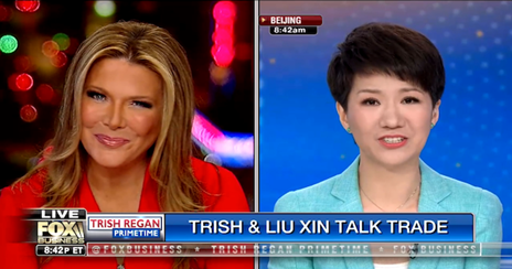 北京时间5月30日8点25分,中央广播电视总台中国国际电视台(CGTN)主播刘欣与美国福克斯商业频道(Fox Business Network)主播Trish Regan就中美摩擦等相关议题进行一场面对面、直击焦点的“跨洋对话”。