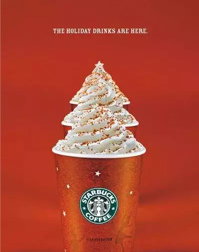 Connecting the image of Christmas tree and features of its products is commonly seen. For example, the poster which is created by “Starbucks”. The bright red cup and Christmas-tree-shaped cream link with Christmas appropriately, and on the cup stands out the logo “Starbucks”. While the slogan is featureless—”The holiday drinks are here.”
