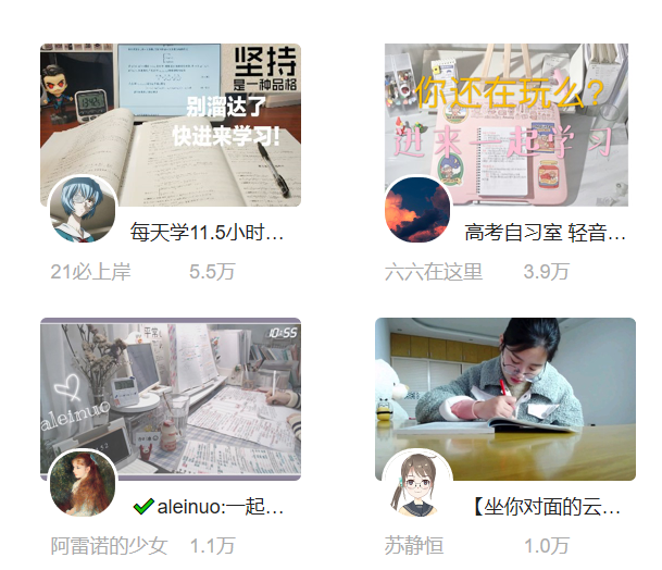 在年轻人中流行的网站“哔哩哔哩”上,我们能看到冠以各种学习目标标题的直播间,比如“高考”“雅思”等。博主通常向观众展示他/她的实时学习情况并配有纯音乐作为背景音。粉丝会评论自己当天的学习目标并且给予博主以鼓励。就算你在家或者其他一些没有像学校一样的学习氛围的环境里,你会感觉有人在陪着你学习,你就会更加专注。当然,因为很多粉丝会看到博主的一举一动,他们就能更加注意自己的行为。