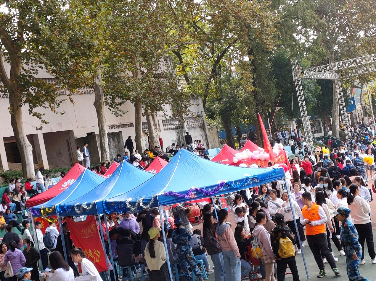 Volunteers would take their own athletes who was arranged to the given position to check in. In the long distance race, students who ran with the runners would take turns to run inside the playground, carrying the flags of their own schools. There were also staff around the playground who raised the flag to indicate the situation to each other. Students in various media departments were taking photos, interviewing or recording; students in logistics department were managing back-up supplies; cheering squads were dancing to cheer; cartoon characters were interacting with students and sometimes the old workers would be attracted to sit down to watch the games, all of which made up a vibrant and colorful picture of the autumn playground.