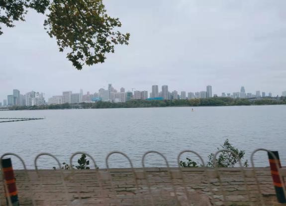 我首要提到的就是在武大背面的东湖。眺望远方,你将会发现视野是多么开阔,湖对岸的建筑就像人一样高。在河边,我看见有人在桥上耐心地等待着钓鱼。
