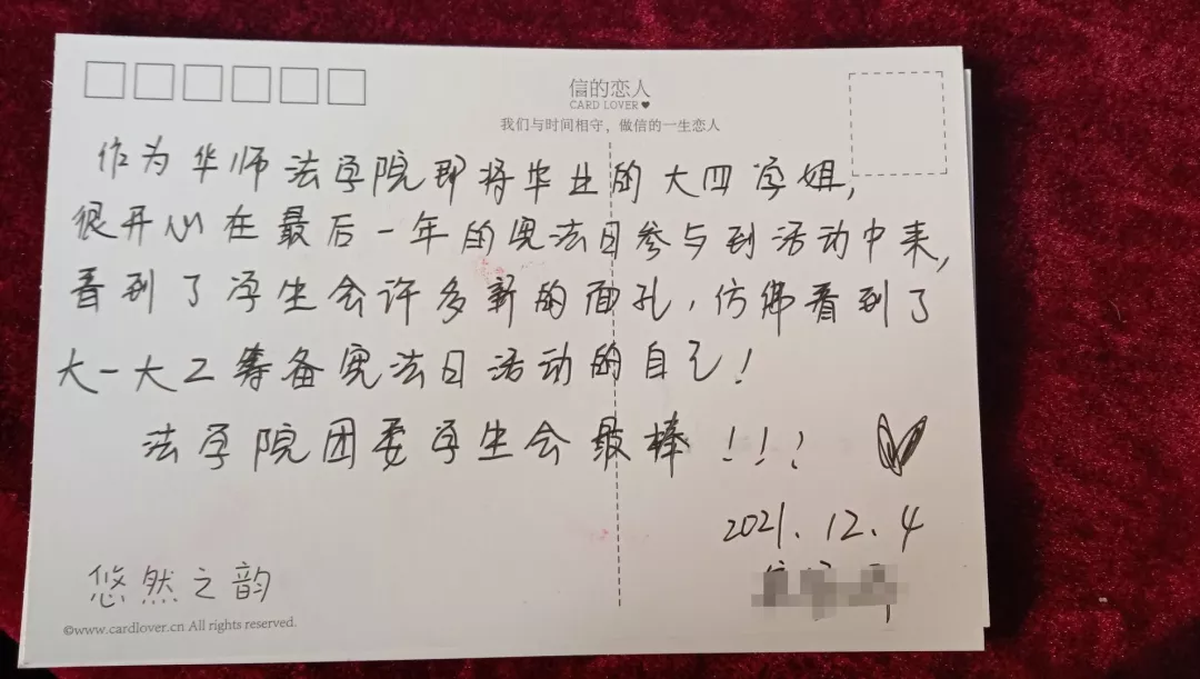 The end point was where students can fill in postcards and questionnaires and redeem prizes. The students raised their pens one after another and left their activity thoughts on the postcards. "It turns out that the constitution can be so interesting", "As a senior school sister who is about to graduate from Law School of CCNU, I am very happy to participate in the event on the constitution day of the last year", "This event made me realize that the constitution is by your and my sides", Everyone communicated with pens and papers, and expressed their love and praise for the constitution garden party with the help of warm words and sentences.