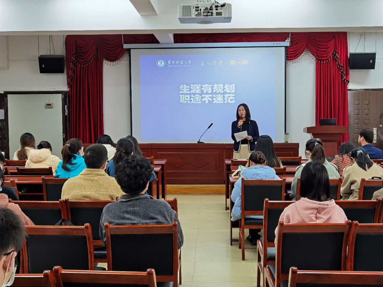 (通讯员:王强、范一欣)3月27日下午,华中师范大学立人学堂首场讲座——“生涯有规划,职途不迷茫”分享会在华中师范大学9号教学楼新闻传播学院842学术报告厅如期举办。讲座邀请到华中师范大学党委学生工作部副处长、生涯教育与就业创业指导专家郎东鹏教授担任主讲嘉宾,来自新闻传播学院、信息管理学院、音乐学院等多个学院的研究生共同聆听了本次讲座。讲座由新闻传播学院研究生辅导员李鸿主持。