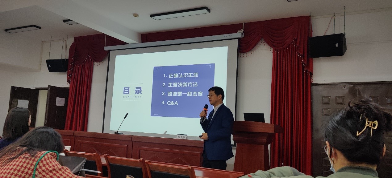随后,郎东鹏从正确认识生涯、生涯决策方法、就业是一种态度三方面展开讲座内容。他首先向大家明确了“生涯”的内涵,并从生涯组成要素、职业选择的偶然性等方面对生涯进行概述,帮助同学们正确认识生涯。他指出,如何做好生涯决策,有多个角度,多种方法,而对于优势的探索与识别则是人类认识生涯选择的最新成果,也是比较可行的方法,对于自己的职业选择则需要保持乐业、善业和适业。最后,他还对就业态度选择进行了观念阐释,并重点强调了秋招的重要性,“秋招包含了80%左右的就业机会,大家需要早做打算”。
