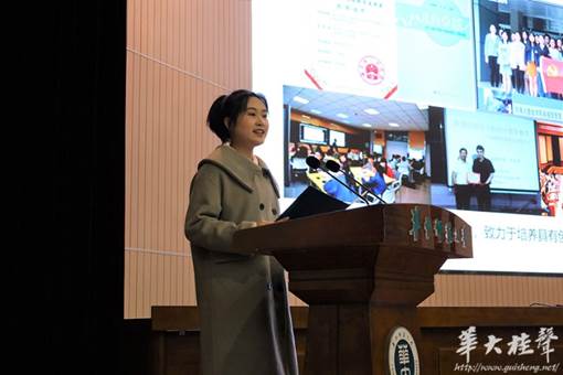 接下来,学生先进集体代表,来自数学与统计学学院2018级卓越教师班的彭玉涵发言,她从志存高远坚信念、厚植学养勤进取、实践创新勇担当、力行“四有”铸明师四个方面介绍了班级为成为卓越教师所做的努力。