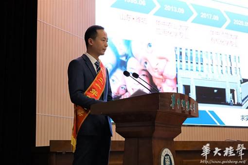 紧接着,校长奖获得者、化学学院2020级博士研究生路福东发言。“四年前,我怀着忐忑的心情从南湖畔来到桂子山上,开启了我的研究生学习生涯。刚开始的我时常因为理论基础和实验操作不过关而感到苦恼,甚至一度怀疑自己到底适不适合走科研这条路。”由此展开,他讲述了自己从开始的迷茫不知方向到如今发表多篇国际顶刊论文、获得多项国内外奖励的成长历程,感谢学校和师长的辛勤培养和同伴的关心帮助,并希望自己勇立时代潮头,不负青春韶华。