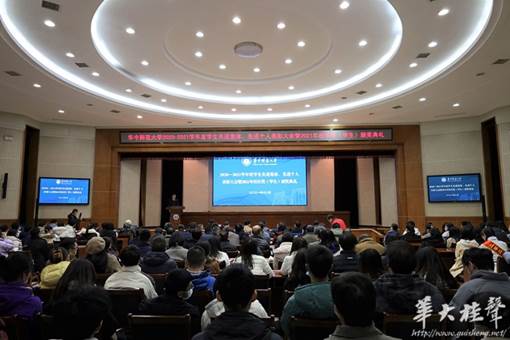 华大桂声讯 12月28日,华中师范大学2020-2021学年度学生先进集体、先进个人表彰大会暨2021年校长奖(学生)颁奖典礼在科学会堂一楼报告厅举行。学校全体校领导出席,学校相关职能部门和各培养单位负责人、教师和学生代表,以及学生先进集体、先进个人代表、2021年“校长奖”获得者参加本次典礼。校党委副书记陈迪明主持。