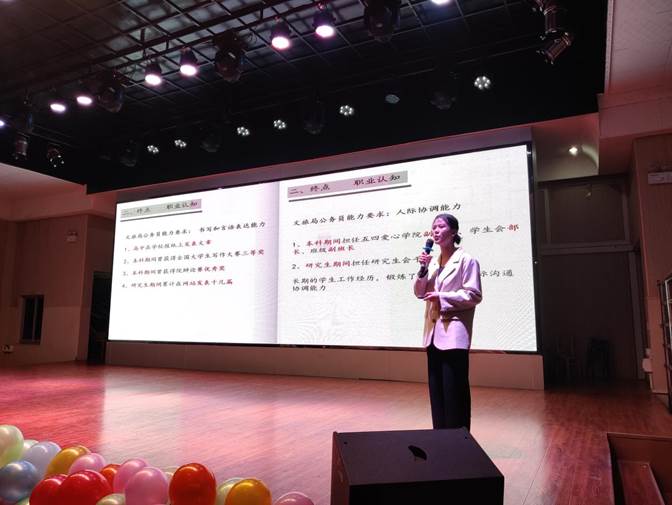 率先出场的是来自化学学院的赵春晖,她以“成长让未来长出头发”为主题,利用量表和数据,明确自己的未来发展方向,制定未来三年的行动计划,向着成为科研工作者的目标前进。