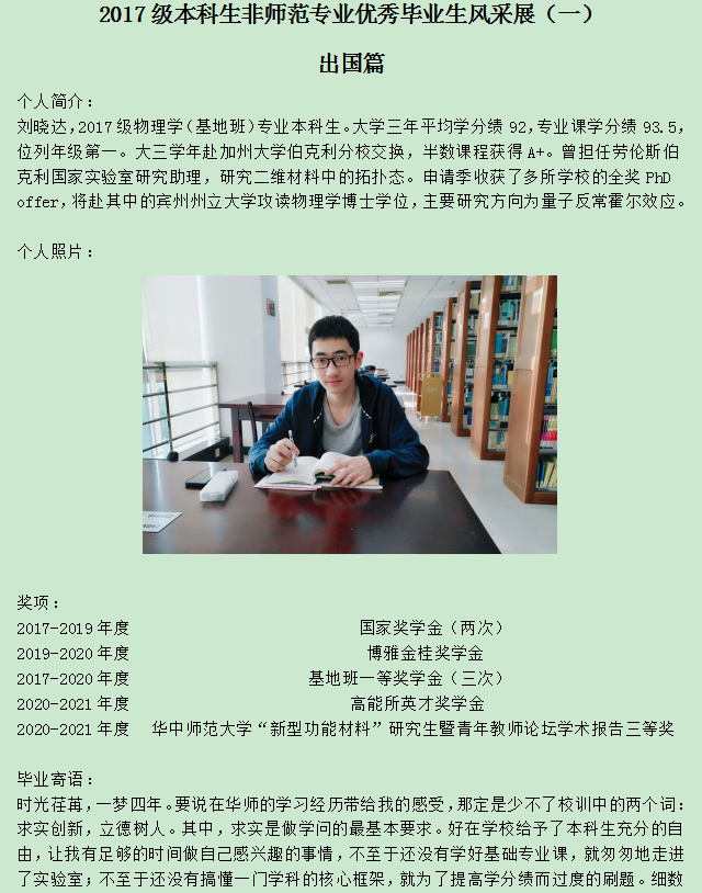 为发挥优秀毕业生示范引领作用,为物院学子树立榜样,学院从即将毕业的本科生和研究生中选取了部分优秀同学作为代表,他们用汗水记录四年来的成长轨迹,以家国情怀肩时代重任,以踏实奋进表青年担当,书写了不凡的物院故事,并借助华大物院微信公众号平台进行系列事迹推送,赢得了很高的反响。