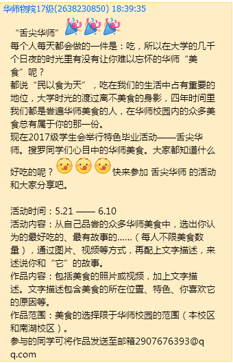 四年大学时光的度过离不开美食的陪伴,令同学们印象最为深刻的,便要数华师食堂里一碗浓浓的人间烟火,众多佳肴里,总有那么一份是蕴含着独特回忆的。17级年级学生会体育部主办的“舌尖华师”活动,意在让毕业生们以推荐华师美食的形式,回顾并讲述自己与华师的独家记忆。