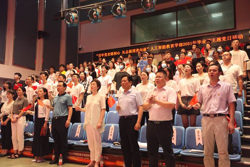 “人工智能教育学部的过去、现在与未来,都是一部永远跟党走的奋斗史。之所以能有这么多‘第一’,最根本的是在于党的坚强领导……”6月15日晚,人工智能教育学部党委书记罗丽华在党史学习教育专题党课中“解密”学部创造多个全国“第一”的“成功秘诀”。当晚,学部党委在演播厅举办并直播“百年党史铭初心 矢志报国勇向前”毕业季主题党日活动,以毕业生为主体的全体师生学百年党史、学红色校史、学奋进部史,在学思践悟中增强砥砺前行信心、践行矢志报国诺言。校党委组织部副部长连海江,校党史学习教育巡回指导组组员、美术学院党委书记付义朝受邀出席,学部党委书记罗丽华、正处职组织员盘华、党委副书记钟文锐、黄涛,教师教育学院副院长吴梦文、董中锋出席,各毕业生支部党员及教师党员代表现场参加,其他师生线上参与了活动。