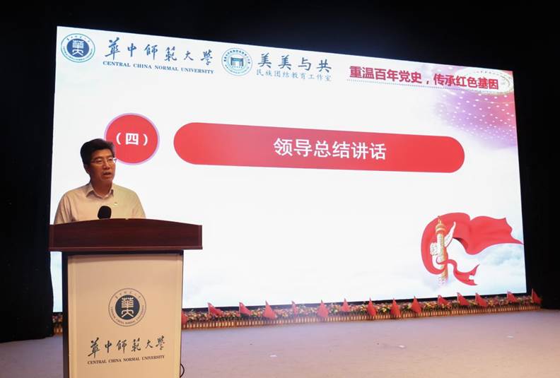 活动最后,由华中师范大学副校长彭双阶为本次活动做总结讲话,他充分肯定了本次“少数民族学生党史学习营”取得的丰硕成果,并对于少数民族学生的未来发展,争做时代新人提出了殷切展望。他指出:“希望大家秉承“忠诚博雅,朴实刚毅”的华师精神,践行“求实创新,立德树人”的校训,怀感恩之心,秉担当之勇,踏实做人做事,为祖国和人民的利益,为民族团结进步和繁荣发展勤奋学习、全面发展,以身边优秀的老师和师兄师姐为榜样,争做新青年,无愧新时代。”