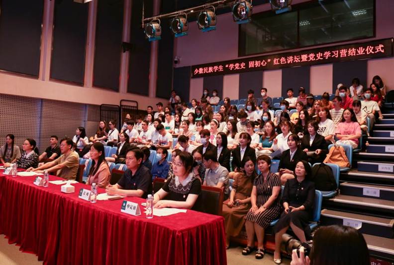 少数民族学生党史学习营结业仪式由一段关于“学习营党史学习教育回顾”视频作为开端,展现党史学习的累累硕果。随后由学习营学生代表赛麦热发言,她从“总结过去,学思践悟增信念;立足当今,凝心聚力勇向前;展望未来,锐意进取谱新篇”三方面总结学习情况、分享感悟收获。