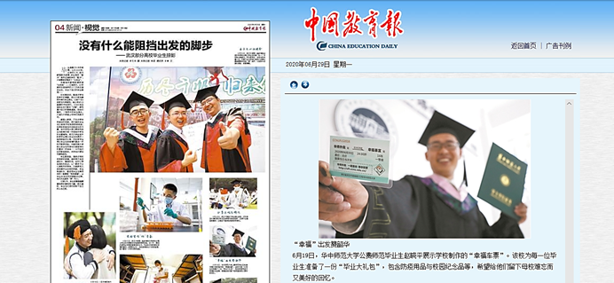2020年6月29日,《中国教育报》刊发了以“没有什么能阻挡出发的脚步”为标题的武汉部分高校毕业生掠影的专题报道,报道了来自武汉各大高校的七名毕业生,其中就有外国语学院2020届英语公费师范毕业生赵晓平。