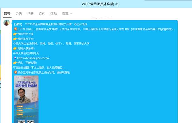在第5个全民国家安全教育日(4月15日)来临之际,美术学院积极响应华中师范大学关于开展“全民国家安全教育日”宣传教育活动的号召,通过线上晚点名、班会及党团组织开展主题宣讲、论坛活动,号召全院学子自主观看2020年全民国家安全教育日高校公开课、《汇聚人民力量,维护国家安全》专题宣传片并撰写心得感悟,采用辅导员“领学”、 学生党员和入党积极分子“导学”、各年级学生交流“互学”的“三学”模式,引导美院学子将总体国家安全观贯穿抗疫全过程,履行应对突发公共事件的职责义务,提升维护国家安全的自觉性和主动性。