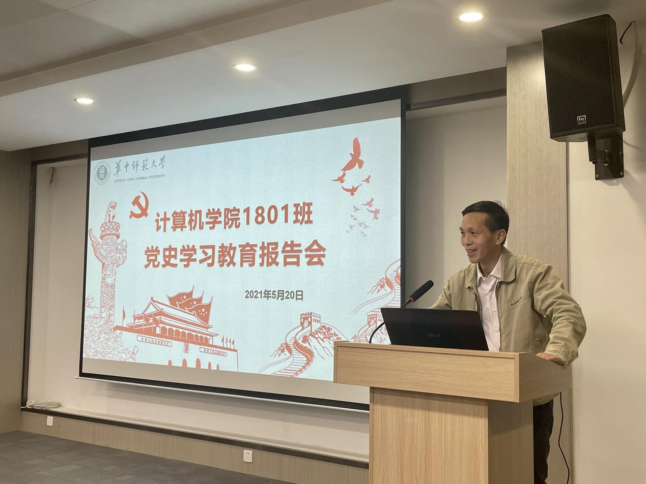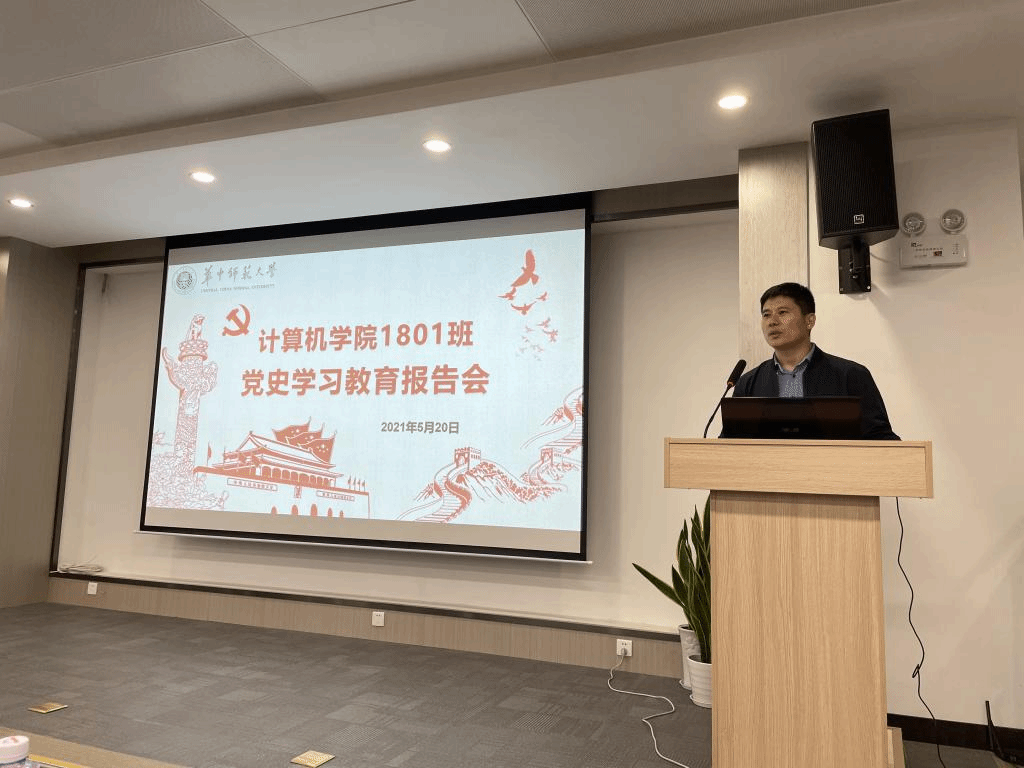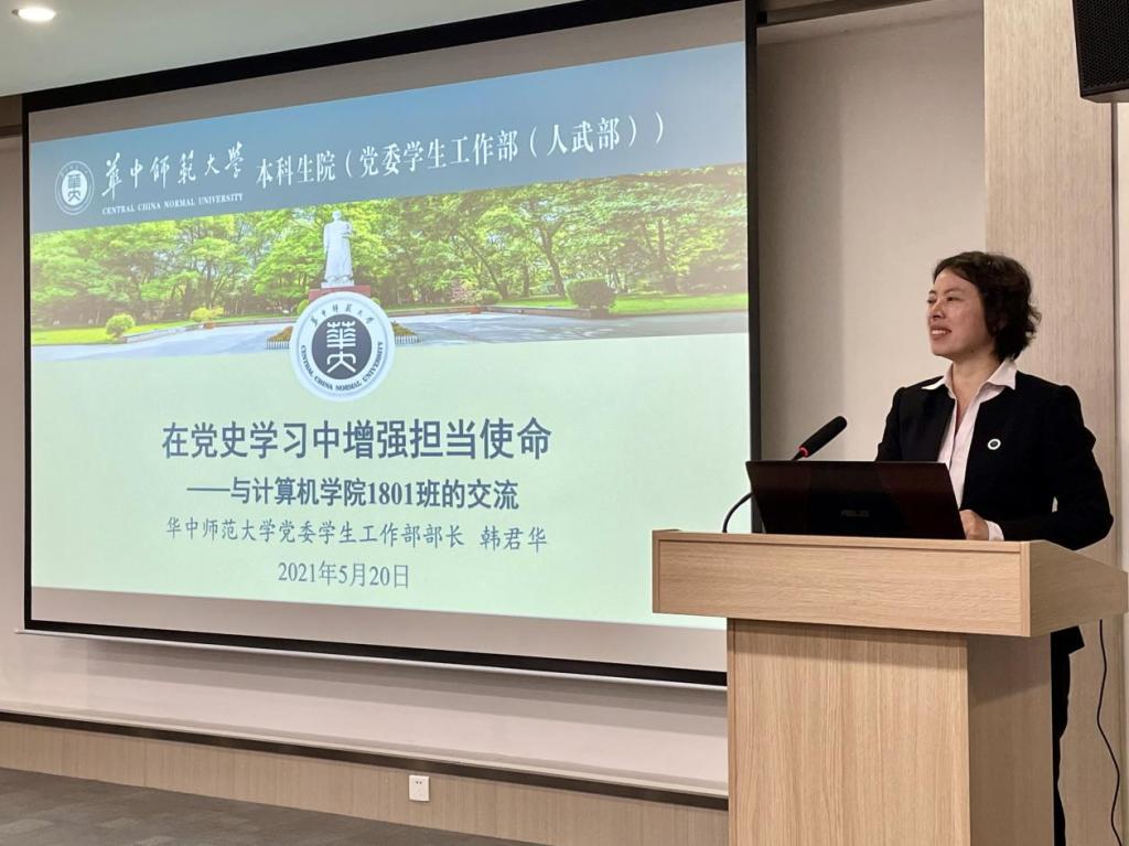 5月20日晚,在南湖综合楼7119报告厅,校党委学工部韩君华部长为计算机学院1801团支部作党史学习教育报告。计算机学院党委书记张小新、党委副书记王坤、郑世珏教授及1801班全体同学参与报告会。活动由计算机学院2018级辅导员范梦宇主持。