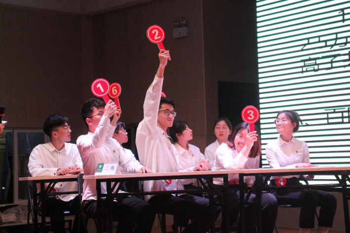 活动进行到知识抢答环节。各组选手集中精力,屏息凝神,等待着抓住第一个机会举牌抢答。此轮答题相比第一轮问答,题型更加丰富、知识覆盖面更广,着眼于考验选手们对党史知识的熟悉程度。参赛选手们热情不减,愈战愈勇。其中,一道提问新中国原子弹发射时间的问题,由于需要精确到具体日期,难住了所有选手。随着知识抢答环节结束,第二轮观众竞赛再次开启。在场观众积极参与,踊跃发言。