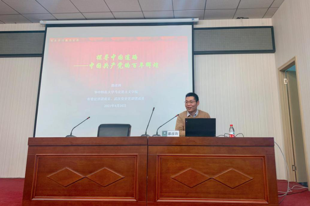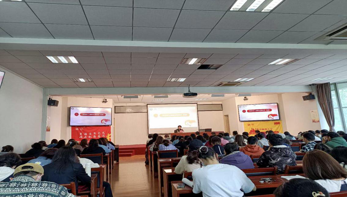 接下来,由本次活动特邀嘉宾马克思主义学院副院长、副教授邵彦涛老师做“党史教育导学报告”。报告围绕“探寻中国道路,中国共产党的百年辉煌”这一主题,从“什么是历史”、“为什么学习党史”两大问题引入,重点阐述“近代以来中国从‘站起来’到‘富起来’再到‘强起来’”的这一伟大飞跃的历史进程,深刻揭示中国特色社会主义不断开辟发展新境界的历史意义,明晰了其背后是中国人民创造幸福生活、一步步实现“中国梦”的生动实践。邵彦涛教授以形象生动的语言、有趣幽默的互动、深入传神的讲解给同学们带来了一场史料详实、鲜活生动、逻辑严密的党史教育导学报告,让同学们对“没有共产党就没有新中国”有了更进一步的理解和认识,同时,也进一步坚定了我们跟党走的信念,坚定了在党的领导下建设好中国特色社会主义的信念和决心。