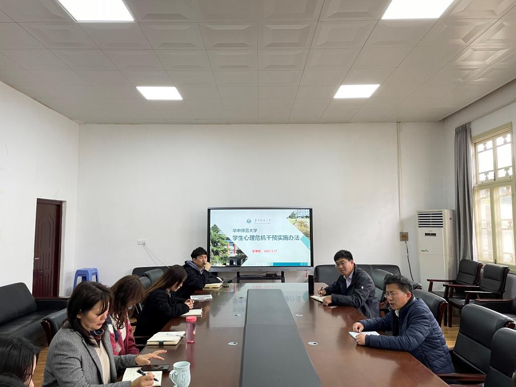 3月17日下午,文学院安全稳定工作会议于学院三楼会议室召开。文学院党委书记朱庆海出席了会议,全体专兼职辅导员参加了会议。会议由副书记徐福刚主持。会上,学院全体政工干部还集体学习了《华中师范大学学生心理危机干预实施办法》。