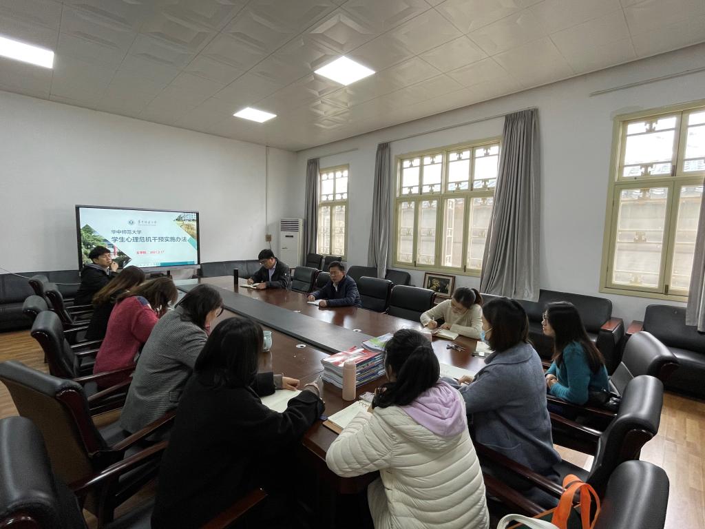 此外,徐福刚带领全体辅导员一同学习了《华中师范大学学生心理危机干预实施办法》。本次学习提高了辅导员们对校园心理危机干预重要性的认识,帮助辅导员们进一步增强了应对心理危机事件的处置能力,对维护学生心理安全,维护学院稳定起到了积极的作用。