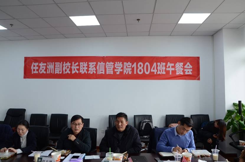 12月23日中午,信息管理学院1804班于南湖综合楼10003会议室成功举办了午餐会,参与本次午餐会的有副校长兼副班主任任友洲、学院院长李玉海、分党委副书记王涛、副院长卢新元、学校办公室潘鑫老师、本科2018级辅导员卢旺以及1804班学生代表,此次午餐会由1804班班主任陈静老师主持。