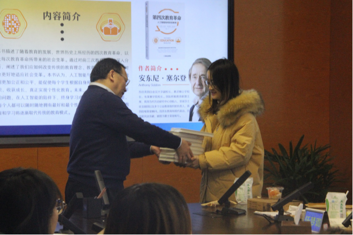 在荐书环节,夏立新向1901班同学赠送了他精心挑选的《未来学校——重新定义教育》、《第四次教育革命——人工智能如何改变教育》两本书,并希望同学们能认真阅读,多掌握与自己专业相关的知识,成为一名对国家有用的人才。