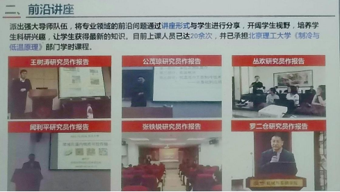在对中科院理化所进行了详细介绍后,邱老师着重讲解了“化学英才班”的建设情况。目前,中科院理化所已与北京理工大学、山东大学、兰州大学等多所高校合作创建“化学英才班”,为科研领域培养更多的优秀人才。在“化学英才班”的授课方面,他强调理化所将派出强大的导师队伍,将专业领域前沿问题通过讲座的形式与学生进行分享,以促进同学们的学习兴趣。理化所的课余活动丰富多彩,邱老师介绍了大学生夏令营活动,例如与院士面对面交流,国家重点实验室、国家工程研究中心参观等活动,旨在帮助学生明确未来研究兴趣和发展方向。