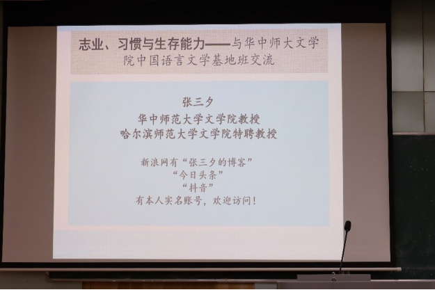 张教授首先向大家讲解了自己的生活经历、研究领域及出版著述,然后分别从志业、兴趣和生存能力三方面对基地班同学未来大学四年的规划提供建议。