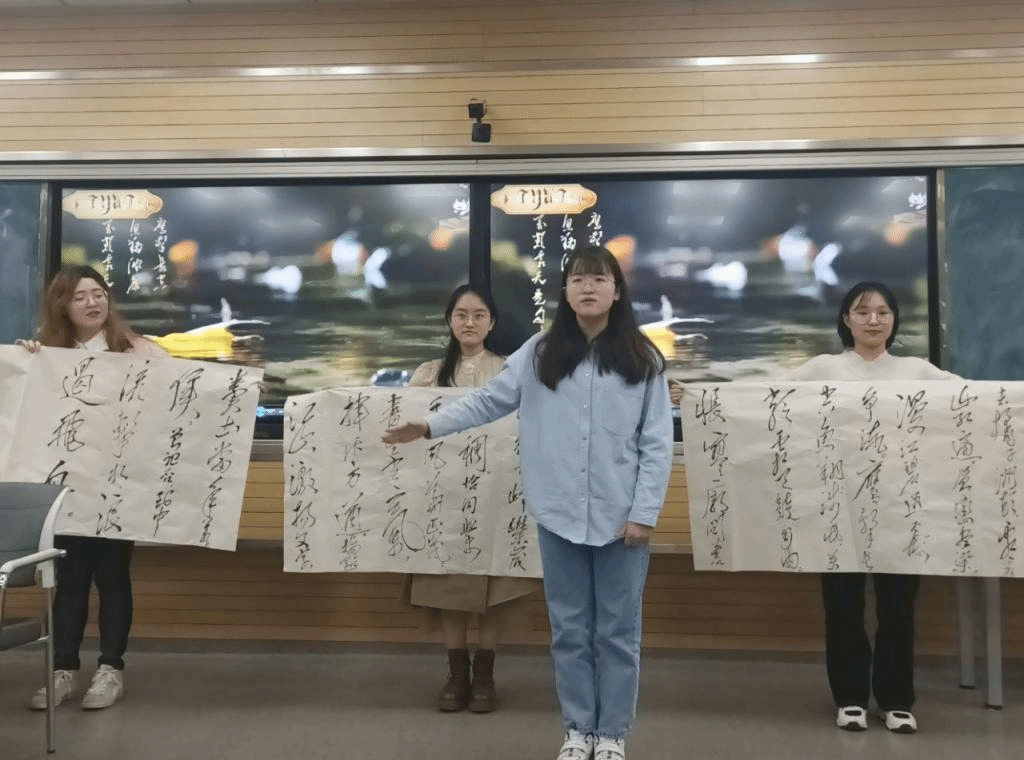活动以暖场环节“诗词扎花”为始,主持人组织全班在牛皮纸上写下个人最喜欢的诗词,用纸包扎花束,作为活动奖励。暖场活动带动了现场气氛,调动了大家参与活动的积极性。在高涨的气氛下,分享活动正式开始。第一组采用讲、演结合的方式,演绎“一代诗鬼”李贺年少成名、英年早逝的一生。组员们用动作、台词演出李贺的人际关系与人生的起起落落,用诗朗诵表达充沛的感情。展示结束后,全班针对第一组的表现展开交流。张宇晗提问李贺“年少成名”与“婚姻”的经历,第一组随即补充说明。第五组分享的是他们心中“最可爱的诗人”苏轼,截取了苏轼人生中“兄弟情深”与“政绩斐然”两个截面进行讲解。展示过后,毕智慧与第五组对苏轼名字的由来交流看法,在探讨中加深对苏轼的认识。第三组创设了访谈与课堂教学的情境,融合朗诵、毛笔书画、模拟教学等形式,演绎一名师范生如何理解《沁园春·长沙》,将个人情感与毛泽东的情感交织到一起。交流环节,第三组补充说明了展示的构思与选点。