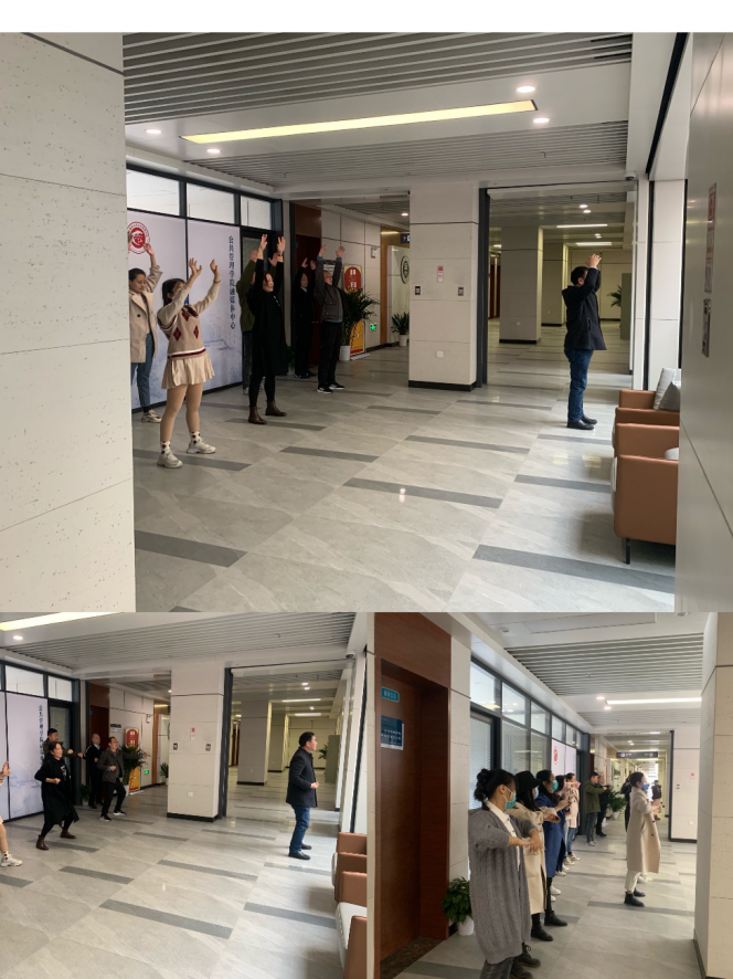 紧接着,是最后一份礼物——“一份健康”。上午大课间,教职工们在周治金老师的带领下,练习气功八段锦。据悉,此次活动是为缓解老师和同学们平时紧张的工作和学习氛围,同时能够活动筋骨,健康身体。从2022年3月8日开始,每天上午9:50—10:10,心理学院8楼中厅空地都会开展八段锦运动,欢迎老师和同学们前来参加。
