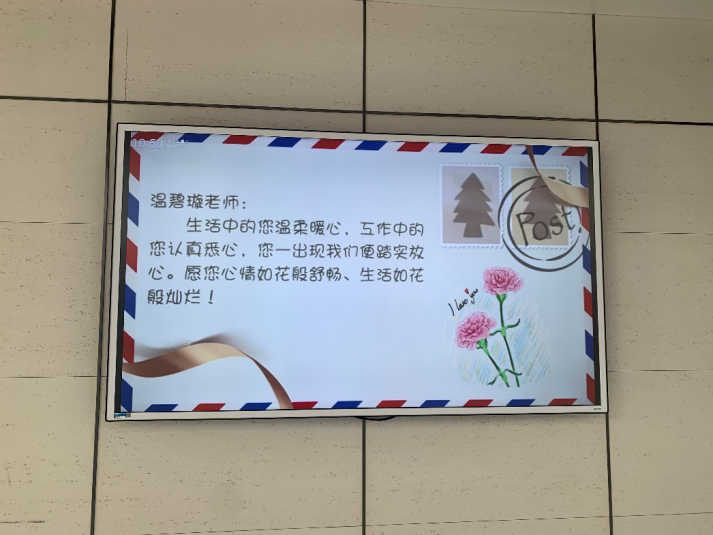 除了节日礼袋,由心理学院数名学生秘密准备并录制的祝福视频在综合楼八楼的显示屏上循环播放着。在这个属于她们的节日中,同学们通过录制视频,向心理学院45位女教师送上诚挚的“一份祝福”。师恩厚重,师生情谊更是珍贵,观看完祝福视频后,许多老师绽放了温馨的笑颜。