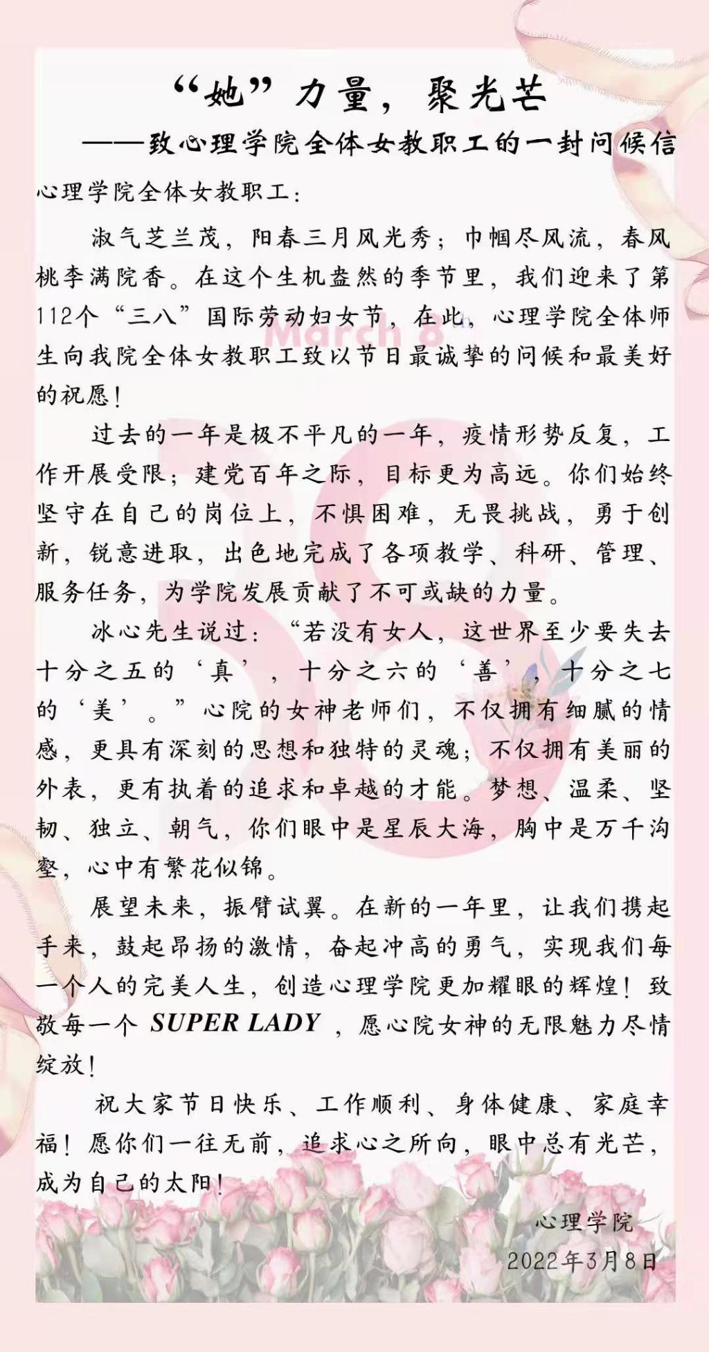 “叮铃铃”手机提示音响起,老师们纷纷打开手机微信,映入眼帘的是一封节日慰问信。心理学院全体师生向我院全体女教职工致以节日的问候和美好的祝愿!