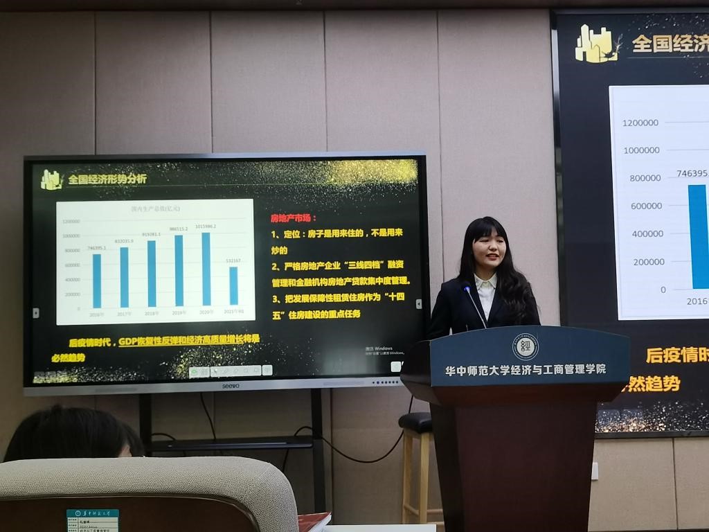 (通讯员:张晓媛)为贯彻人才培养与社会需求相结合的宗旨,坚持学校教育与社会实践相结合的理念,不断提高应用型人才培养质量,华中师范大学第十三届“易居杯”房地产策划大赛校内选拔赛于2021年11月8日下午在南湖综合楼10127报告厅举行。本次比赛有邓宏乾、王佑辉、刘红萍、洪建国四位老师莅临指导;应疫情防控要求,陈淑云、陈锋两位老师进行线上指导,团委书记岳峥嵘老师,副书记赵万老师莅临观赛,总共有8支队伍参加本次比赛。