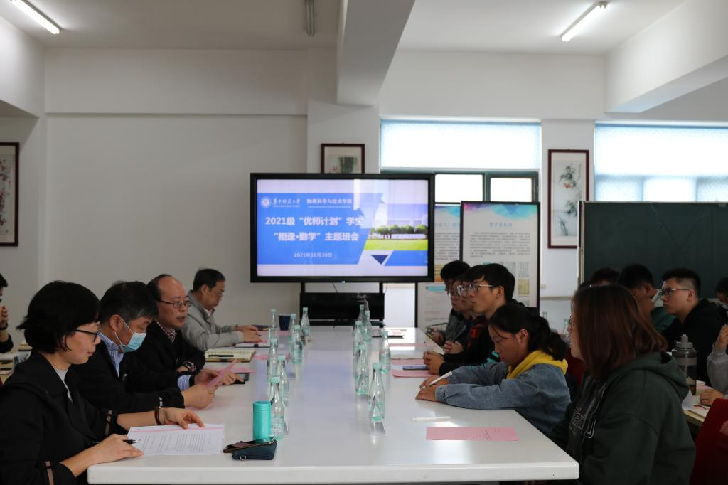 10月28日上午,物理科学与技术学院2021级“优师计划”学生主题班会在9551会议室举行。班会以相逢和勤学为主题,旨在勉励学院招收的首届“优师计划”学生在新的起跑线上奋发,为四年后成长为祖国乡村振兴所需要的“四有好老师”开好头,起好步。学院党委书记张明生,院长张本威,副院长吴少平、黄光明、俞云伟,师范专业教师代表冯秀梅,班主任代表余颖、池丽平,教学秘书黄先莉,辅导员姜春勇和学院2021级“优师计划”全体学生参与班会。班会由院党委副书记马英主持。