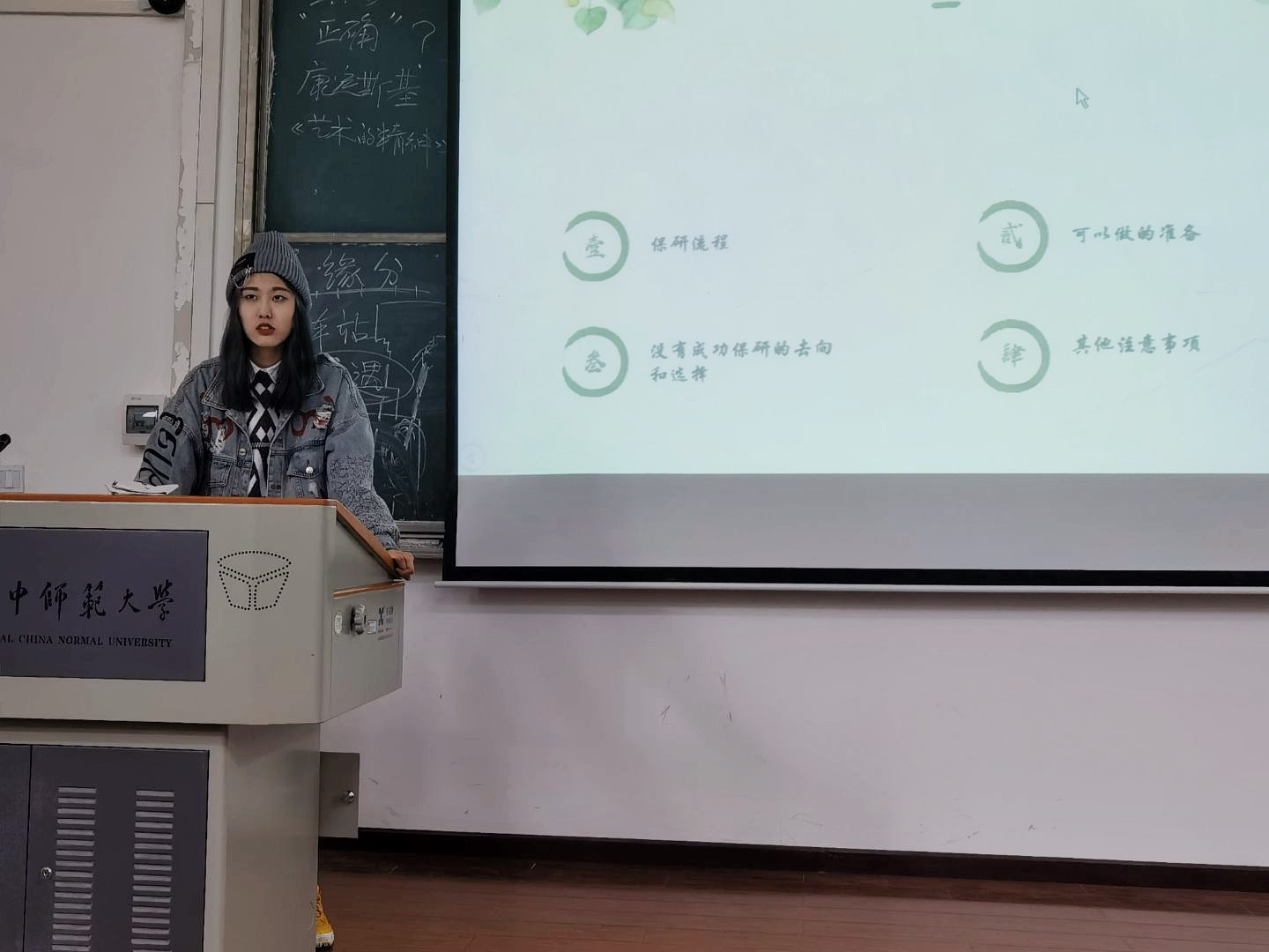 随后,何新月进行了保研与科研立项的经验分享。在保研分享中,何新月首先介绍了保研流程、2020年华中师范大学文学院的保研政策,随后从保研信息渠道、推荐信、学分绩、英语成绩、个人陈述、具体面试等方面介绍了自己的保研经验,提到了保研失败的去向,最后何新月强调了定期体检、英语学习、平时分等个人注意事项。