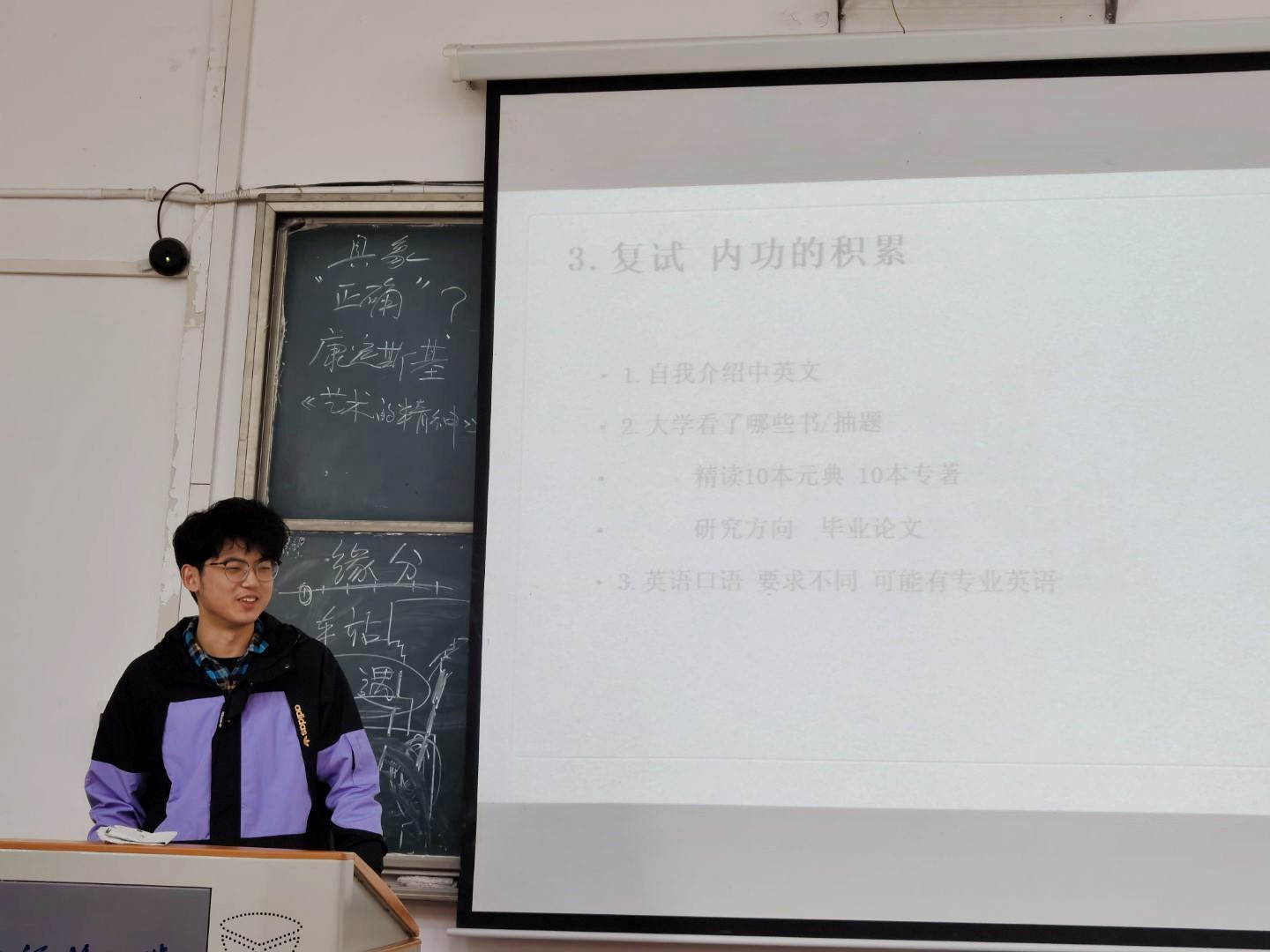 分享结束后,王海龙老师组织了提问答疑环节,同学们积极举手提问。王逸飞就“如何上专选课”这个问题进行了回答,提到在阅读理论类书籍时要读提纲性章节,提炼关键词,认真做读书笔记,梳理层次脉络。针对“如何练英语口语”这个问题,何新月建议先背单词、背演讲文章来建立自己的语料库,然后要提高执行力,勤加练习。被问及保研夏令营的作用,何新月回答,夏令营的优秀营员除了在推免时会优先录取,在相应学校的保研复试时也会有一定优势,具体可参见各高校夏令营的开营仪式等。关于雅思、托福成绩的必要性,何新月回答,保研夏令营可以选择六级成绩或雅思成绩进行申请,在留学时,雅思、托福等成绩十分重要,且文学类专业英语要求较高,建议努力提高雅思成绩,考研时的英语学习也可以参考部分雅思阅读文章、雅思写作。