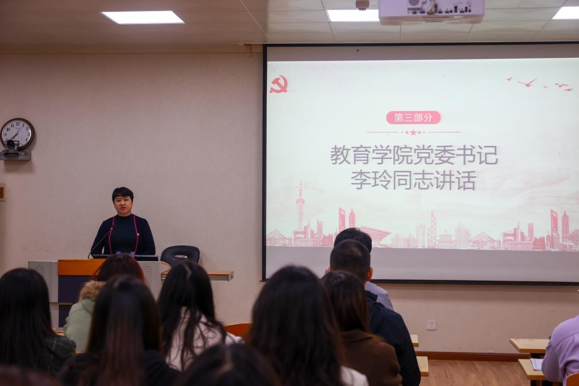 第三项,教育学院党委书记李玲讲话。她进一步明确了学生党建中心的工作职责,并对学生党员和学生干部提出三点期望:一是提高政治站位,旗帜鲜明讲政治,加强理论学习;二是强化责任担当,将政治自觉思想自觉转化为行动自觉,勇于担当作为,胸怀理想抱负,不忘初心使命;三是提升工作能力,要学习方法、找准方向、规划目标,作为党员和学生骨干,关键时刻能够顶得上拿得起,高质量完成任务,为学院发展添砖加瓦。最后她祝愿党建中心顺利发展,并表示将和同志们一起推动学院党建工作,为营造风清气正的生态积极贡献力量。
