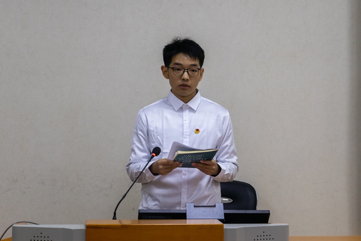 第四项,党建中心党校部部委邵腾飞作为学生代表发言,他讲述了自己与党的红色情缘,并以“坚守理想信念、坚定服务信念、坚持严于律己”与同学们共勉。