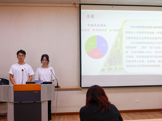 本次评选共设现场答辩和才艺展示两个环节。在现场答辩环节中,本科2020级年级主席万义辉、团支书肖函妤表年级进行答辩。他们围绕落实实效要求、打造专业特色、开展党史学习、践行知行合一四个维度对过去一年里师范生集体的日常工作、特色活动做了介绍,具体形象地展现了2020级本科生奋发进取的风采和立德树人的情怀。在答辩结束后,王倩倩针对PPT设计的美观性、讲稿内容的适切性及思路的逻辑性提出改进建议。