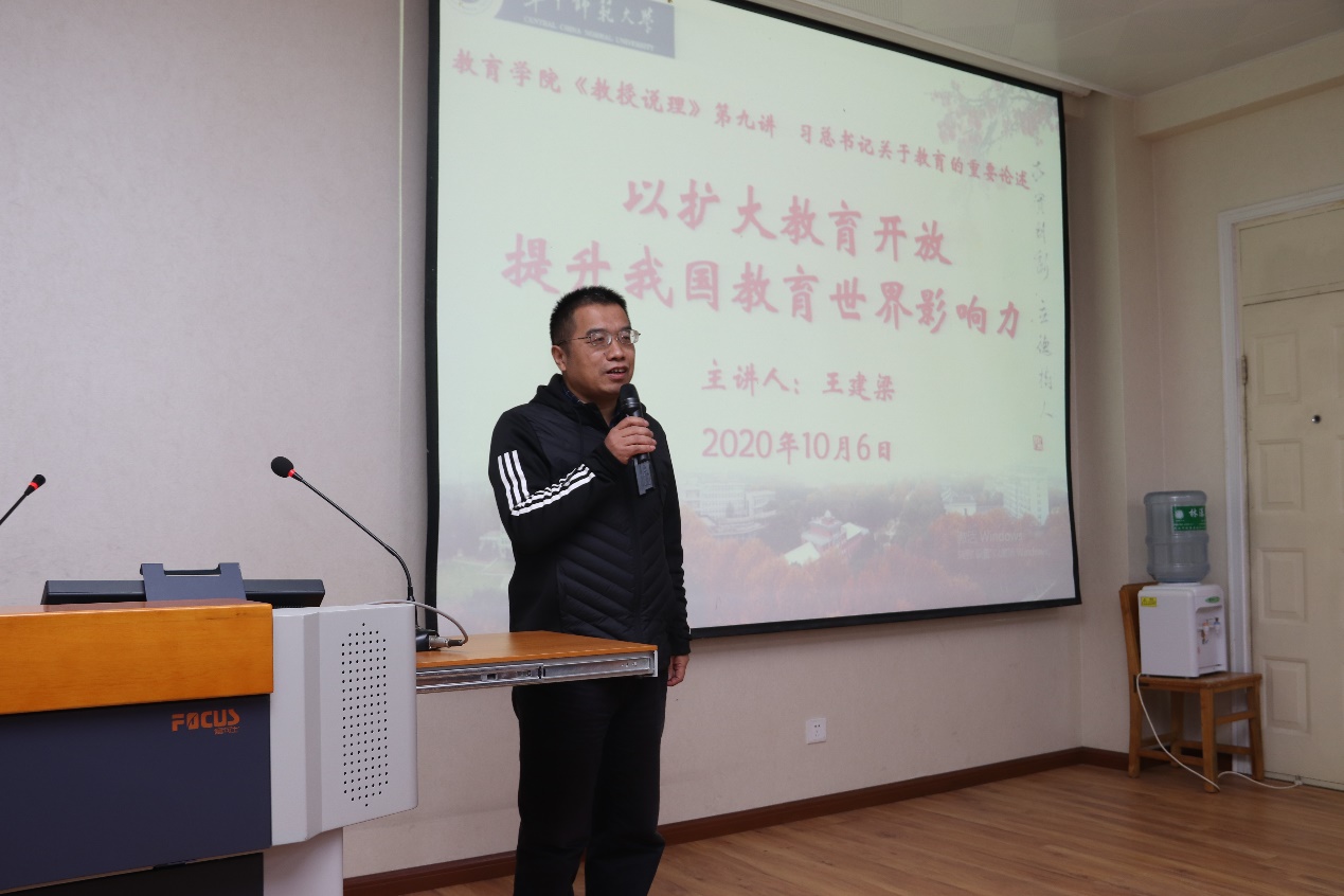 2020年10月6日晚, “习近平总书记关于教育的重要论述”第四场专题报告会在田家炳502教室成功举办。我院博士生导师、华中师范大学国际学生教育发展研究中心副主任王建梁教授作题为“以扩大教育开放提升我国教育世界影响力”的专题报告。此次活动由副院长申国昌教授主持,教育学院2020级全体研究生新生参加。