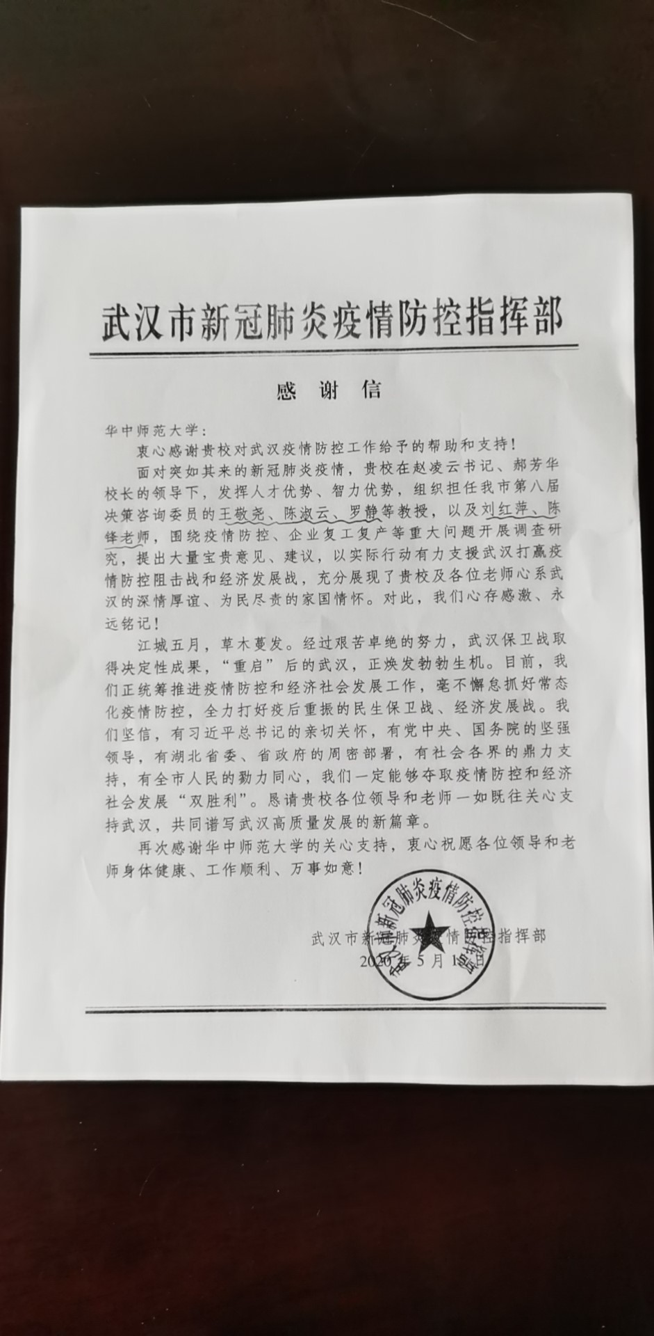 围绕疫情防控,企业复工复产等难题,本支部的陈淑云、陈峰和刘红萍等教师,利用个人的学术特长和专业优势,向本地的疫情防控决策部门提供了多份建议报告,其中多份报告得到地方政府部门采纳或领导批示。为感谢这些老师们的突出工作,武汉市新冠肺炎疫情防控指挥部还专门向学校发送了感谢信。
