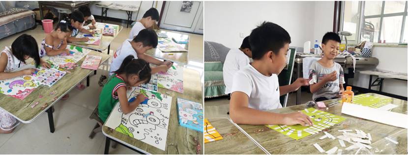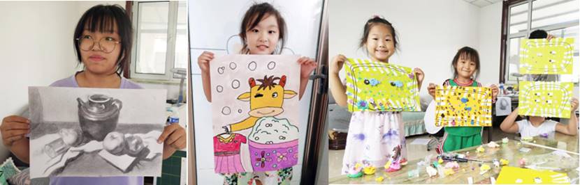 美育课堂前,同学们做了精心准备,为了让贫困孩子们得到高质量的美术教育,同学们不仅为孩子们准备了各类画笔、纸张、水彩,甚至连小小的剪刀、胶水、橡皮都一一俱全。实践队育美于教、融美于学,把环保意识、爱心教育、感恩教育融入到美术课堂中,培养孩子们认识美、发现美和创造美的能力,挖掘并激发孩子们对美术的兴趣。短短几天里,这些很少接触美术甚至于从未拿过画笔的贫困孩子们在队员的指导下绘画出一幅幅优秀的儿童绘画作品,制作出一个个精美的手工作品。