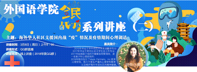 3月8日,外国语学院本科2018级英语系开展的“全民战‘疫’”系列主题讲座第二讲在线上开讲。讲座邀请学院2015级校友、纽约市健康医院管理局的青少年心理咨询师胡中小荷女士担任讲座嘉宾。