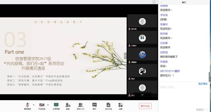 蒋可鸣老师发言后,年级主席武晓红开始通报2017级“共抗疫情,我们在e起”系列活动的进展情况,主要包括与疫情相关的作品征集活动、flag挑战活动、和收集各专业同学疑问、困惑的解答情况。她表示在同学们积极配合和老师们的耐心指导下,各项工作进展顺利。