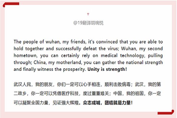 自活动征集开始,外院学子踊跃投稿,截至目前,共收到来稿55篇。他们用不同的语言、不同的形式表达了共同的期盼和祝福:期盼疫情早日结束,并祝愿正在奋斗中的人们早日迎来胜利的一天。其中,来自英语系的张圆圆和李贵分别用诗歌和文字表达了自己对医务工作者抗击病毒、保卫人民的感激与愿他们平安归来的美好祝福。身处在疫情较为严重的湖北,翻译系张诗雨在英文诗歌中直言:有如此强盛的祖国为支柱,我们湖北人绝不惧怕。除此之外,外院学子也通过诗歌、手写文字和画图的形式为武汉加油。西语系的卢智琛用简短的西班牙诗歌助力武汉,“得胜的结果无可辩驳”流露出打赢“抗疫阻击战”的坚定信念。日语系的龚昌乘和冯文涛则用日语书法为武汉加油。
