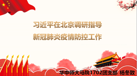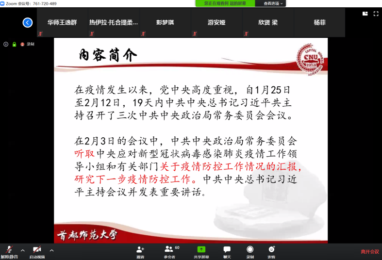 本次活动由马院的杨冬致与首师大马院的白盛志两位团支书共同担任主持人,在互相介绍双方院校后,杨冬致带领同学们学习了《习近平在北京调研指导新冠肺炎疫情防控工作中的讲话》,何瑶带领同学们学习了《在中央政治局常委会会议研究应对新型冠状病毒肺炎疫情工作时的讲话》,从集中救治、社会管控、舆论引导、统一指挥等多方面学习讲话精神,号召同学们从自身出发,积极参与防控,坚定信心,共克时艰。