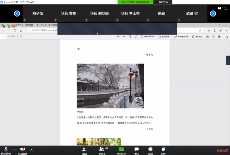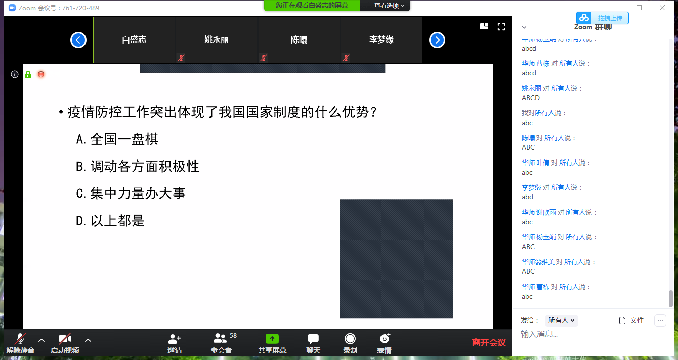 本次活动将两校同学分为七组,自选主题进行交流,并依托ZOOM平台,以音视频、屏幕分享的形式进行相关主题的分享讨论交流,两校马院学子纷纷发表自己的见解,讨论热烈。积极学习有关疫情防控的基础知识,确立“不信谣、不传谣”的责任担当,分享居家抗疫的生活心得,调节战疫心态,坚定信心。同时还交流了阅读学习和师范技能提升的资源、方法。