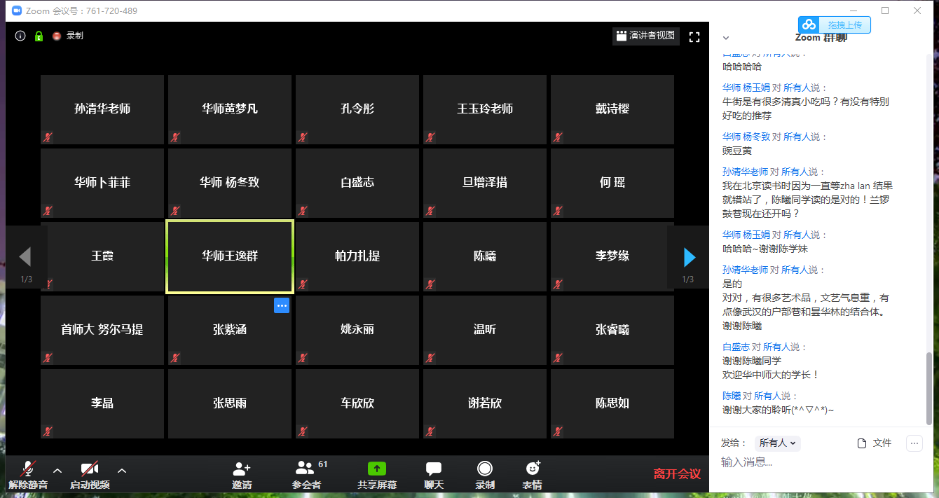 针对本次活动,两个班级的班主任华中师大孙清华老师和首师大王玉玲老师均用三个关键词进行了概括总结,并为同学们疫情期间的学习生活提出几点建议。