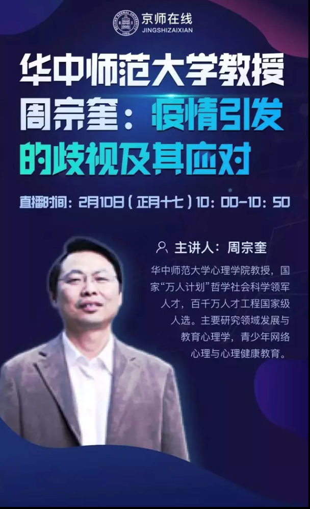 华中师范大学心理学院周宗奎教授作为青少年心理健康教育领域专家以及高校心理健康教育专家指导委员会委员,积极响应教育部号召,于2020年2月10日开展面向全国大学生的《疫情引发的歧视及其应对》在线培训讲座。讲座内容主要从三个方面展开,分别是针对“新冠肺炎”的歧视现象,疫情相关歧视的成因及疫情相关歧视的应对。首先,周宗奎教授在历史发展、社会现实、理论定义以及实证调查等基础上,介绍了歧视的概念、类型、成因以及本次疫情引发的歧视现象。其次,周宗奎教授分别从社会认知、情绪偏向、行为偏向以及中介机制等四个方面解释了歧视的成因。最后,周宗奎教授从个体层面和社会层面具体说明了如何应对歧视。在总结时,周宗奎教授强调全社会应隔离病毒,不应隔离爱,总结以“三心”做好心理抗疫,并认为消除疫情引发的歧视是个人的成长,群体的文明甚至是人类的进化。